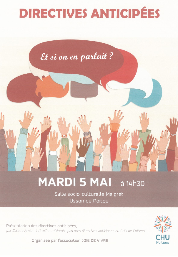 L’association Joie de Vivre d’Usson du Poitou organise une réunion d’informations sur le thème « Directives anticipées » le mardi 5 mai 2026 à 14h30 à la Salle socio-culturelle Maigret.